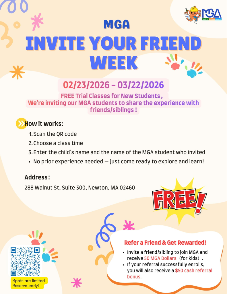 During the upcoming weeks, current MGA students are welcome to invite friends to join a class at MGA at no cost. This gives new students the opportunity to experience our hands-on learning environment while exploring, building, and creating together.